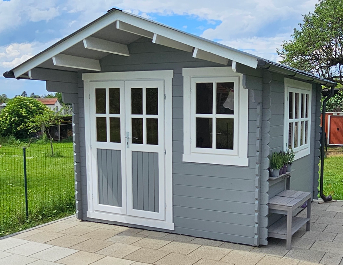 Ein Gartenhaus streichen in moderner Grau-Weiß Kombination